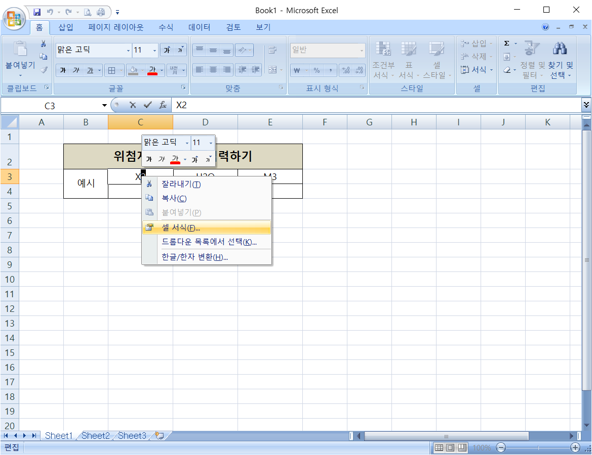 숫자2를 블록 지정해주시고, 셀 서식에 들어가서