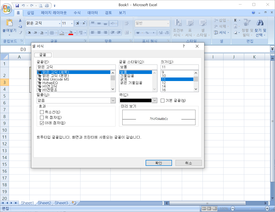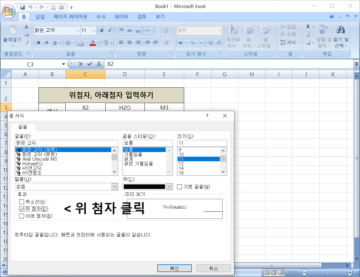 이상 엑셀 위첨자, 아래첨자를 활용한 수학 수식 및 화학식 표시하는 법에 대해 알아보았습니다.